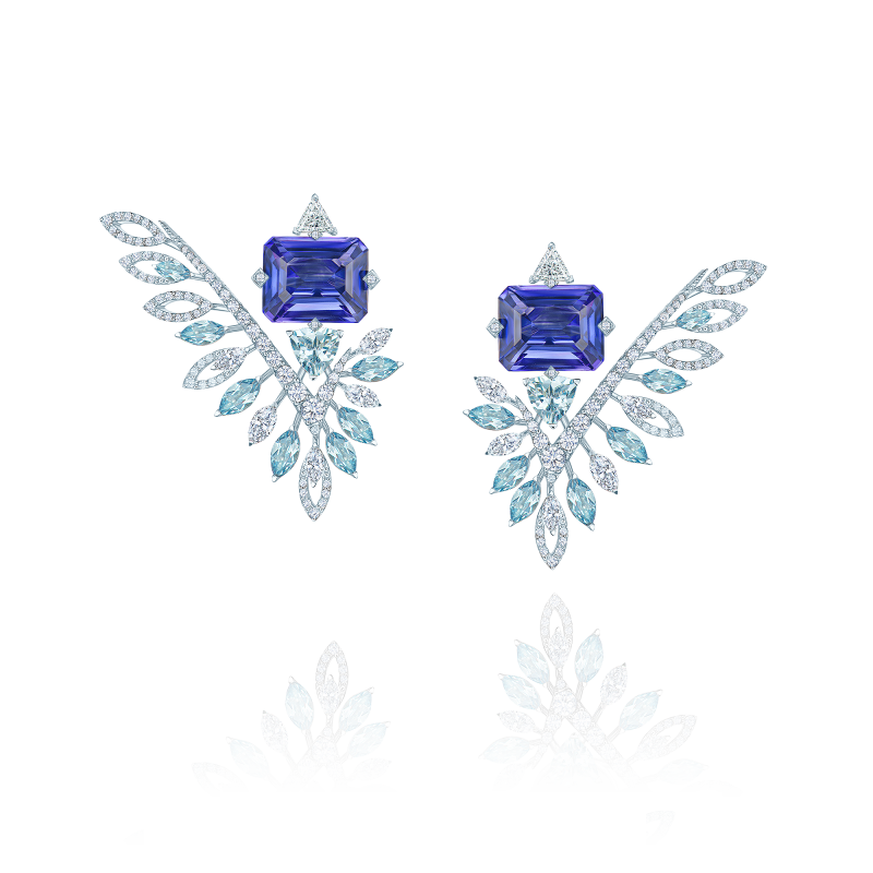 Octagon-cut tanzanites. Marquis and trillion cut aquamarines. Marquis, trillion and round cut diamonds.