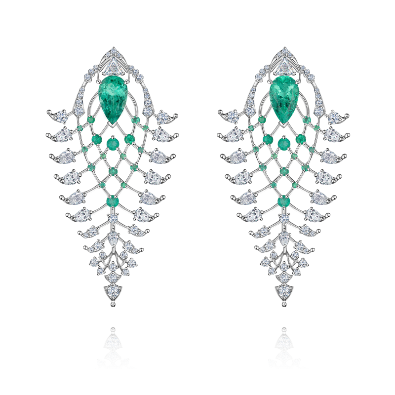 Pear-cut and round-cut emeralds. Pear-cut, trillion-cut and round-cut diamonds.